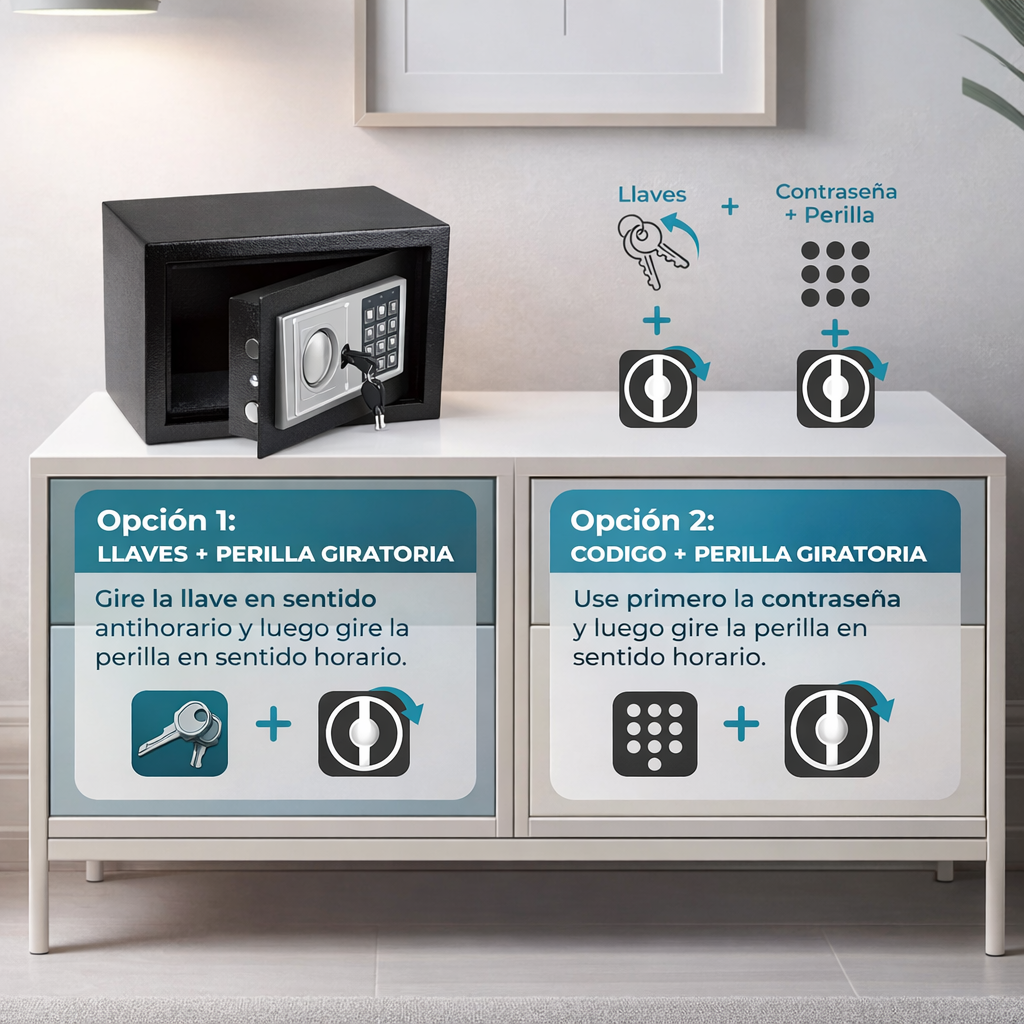 - Seguridad doble: código electrónico + llave mecánica para máxima protección.