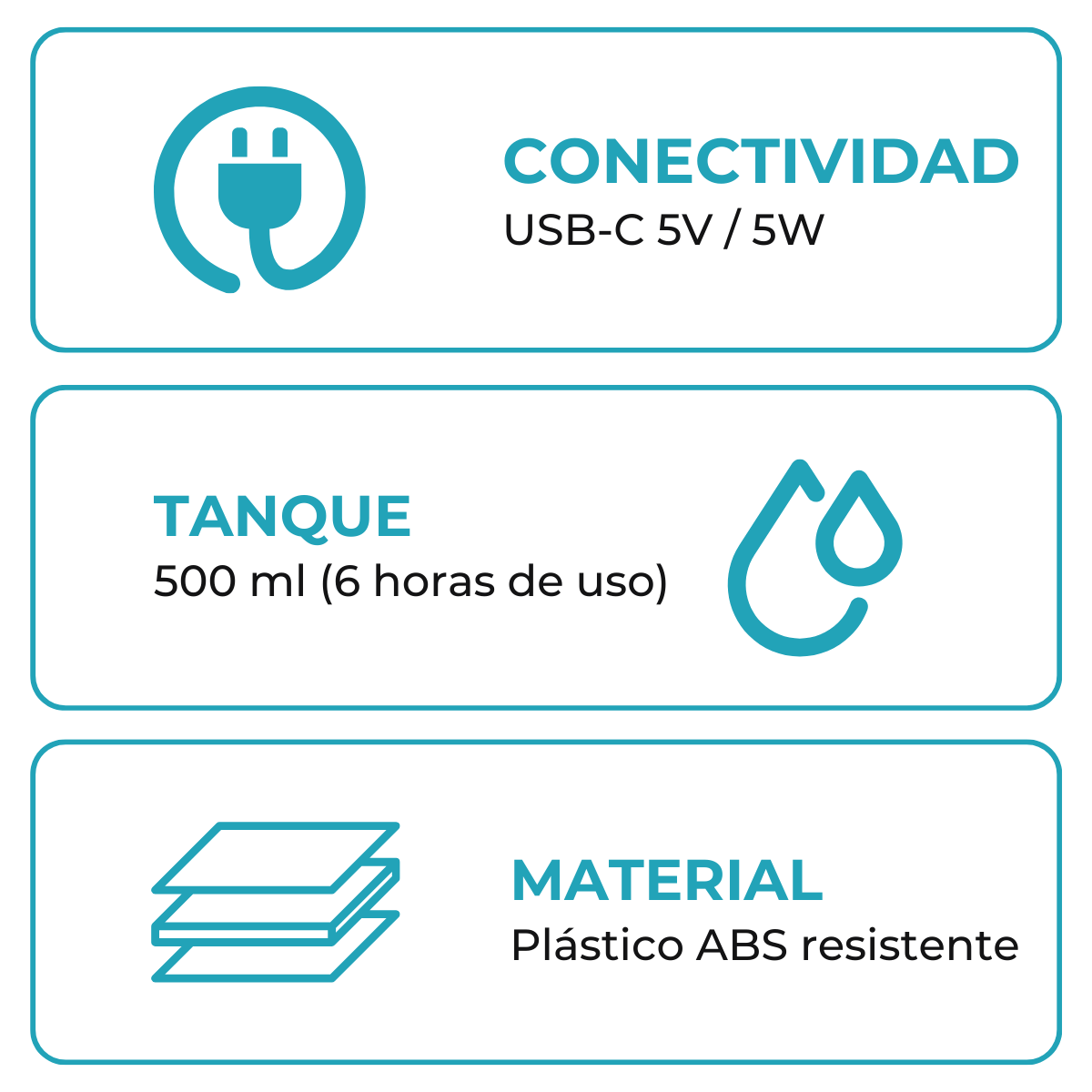Con tanque de 500ml, 3 velocidades ajustables y conexión USB-C. Funciona como ventilador, humidificador y purificador de aire portátil.