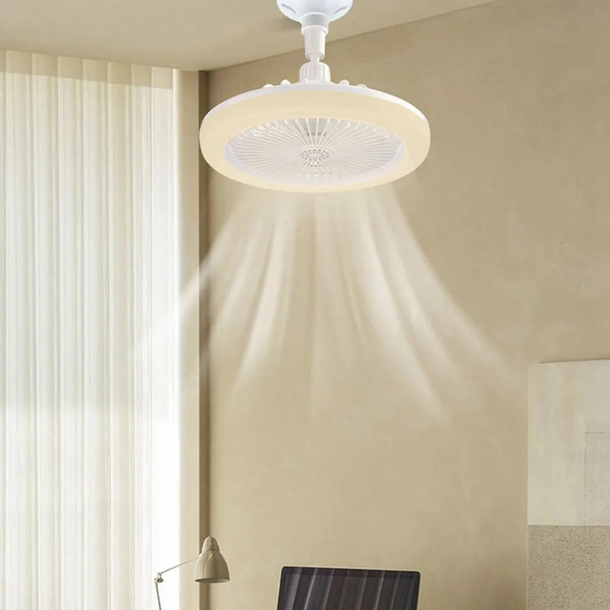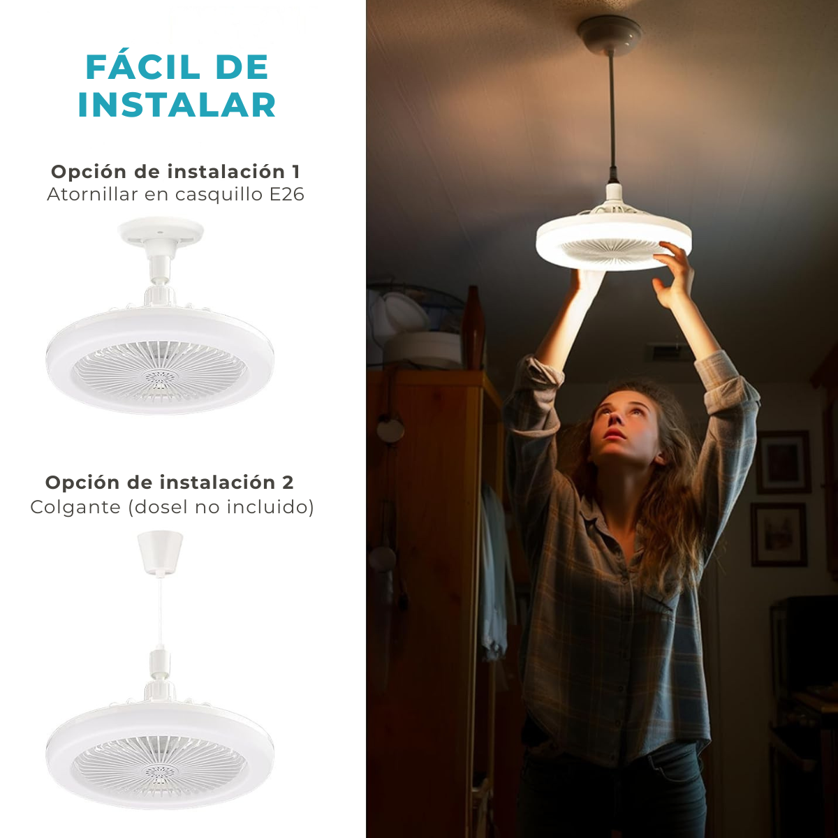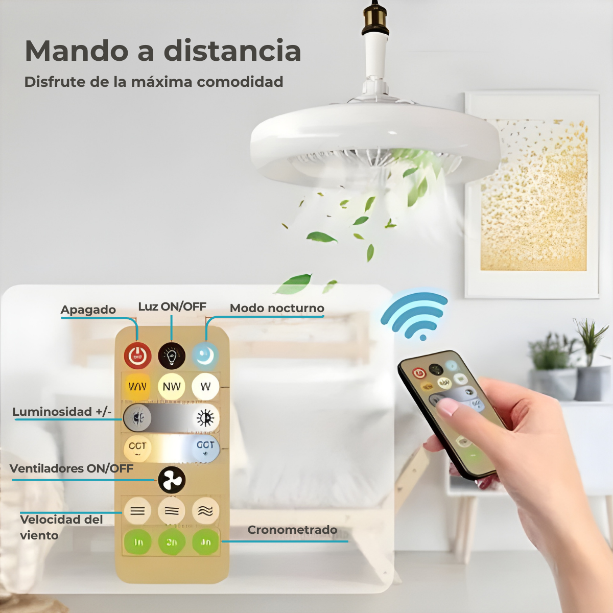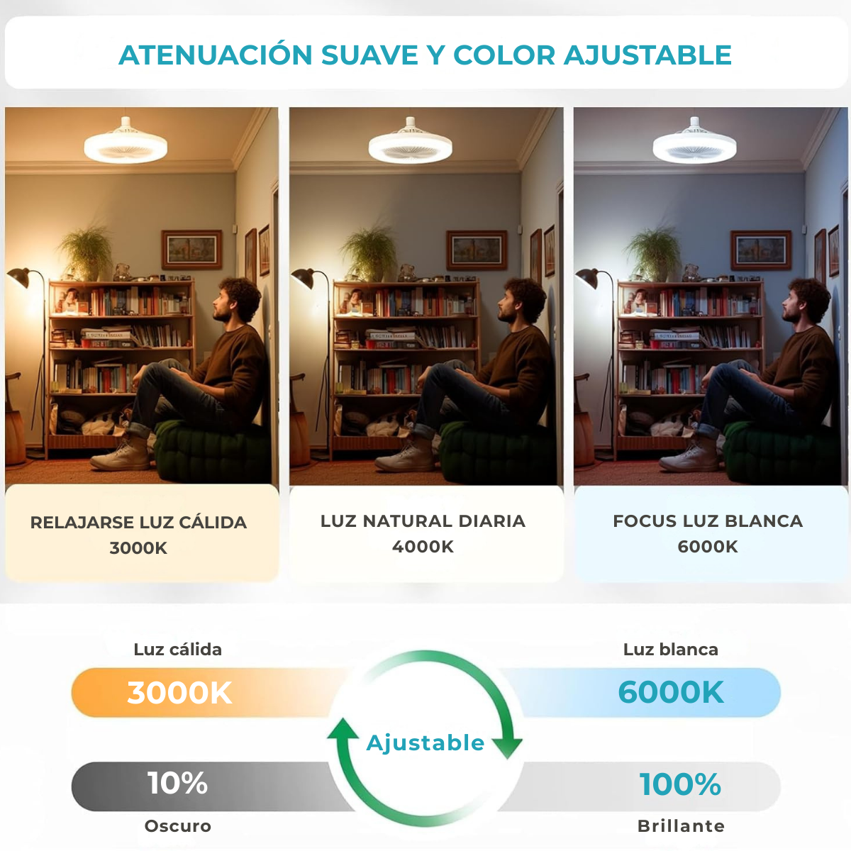 El ventilador de techo con luz LED integrada combina iluminación y ventilación en un solo producto. Ofrece 3 velocidades de aire y 3 tonos de luz ajustables (cálida, neutra y fría), adaptándose a cada ambiente.