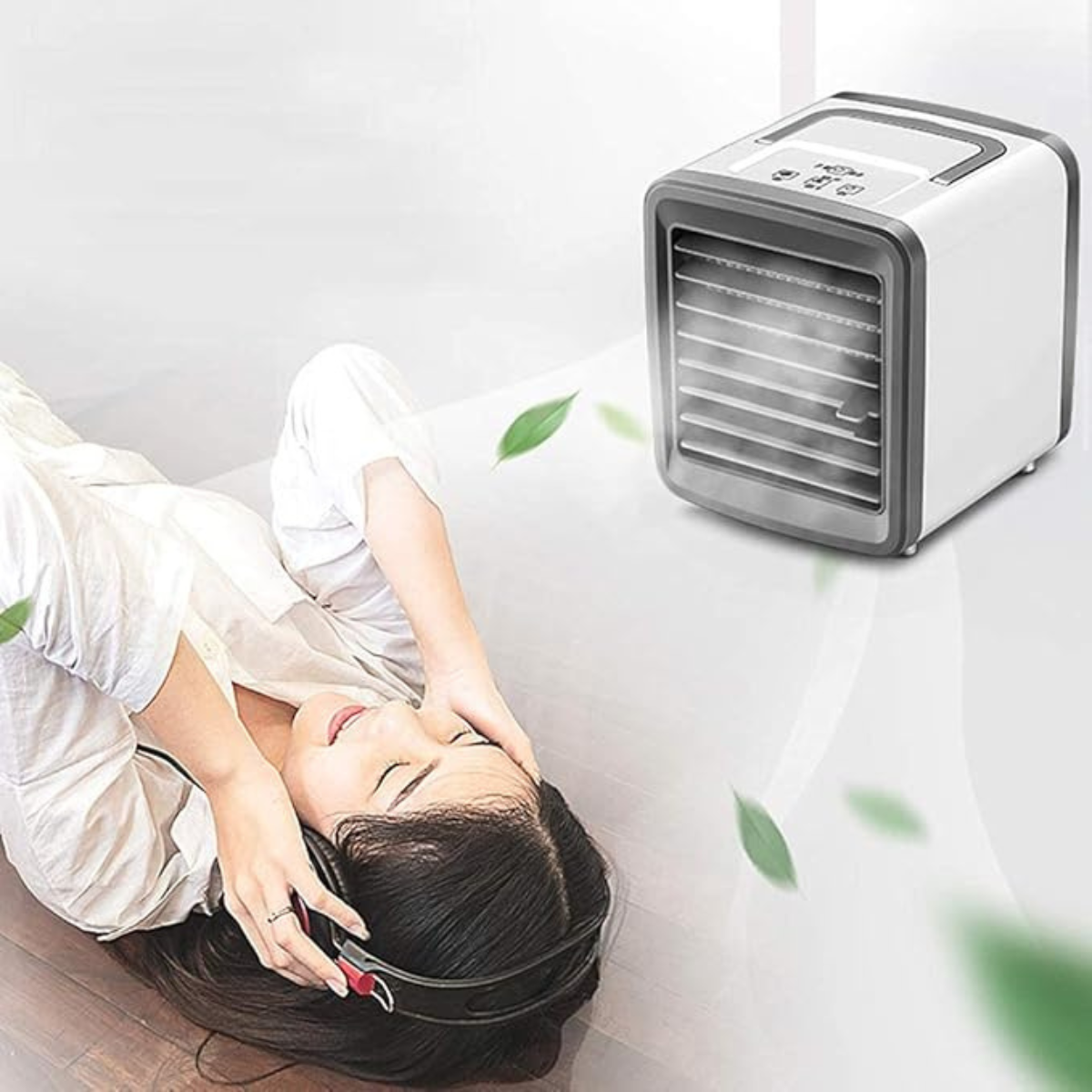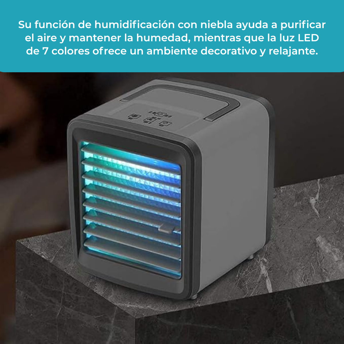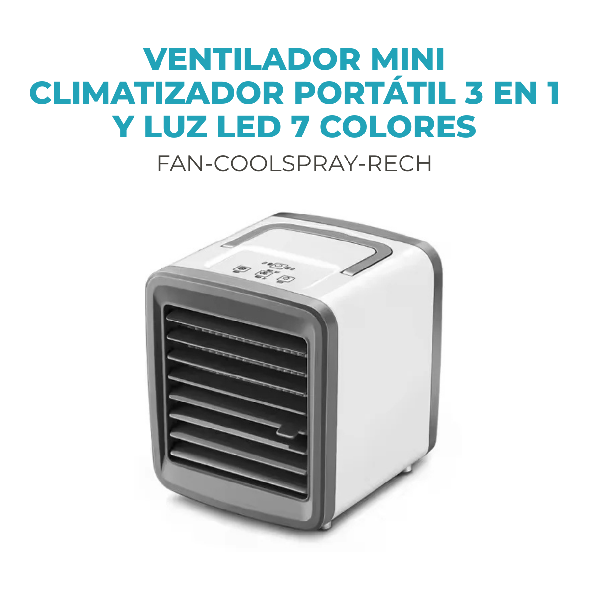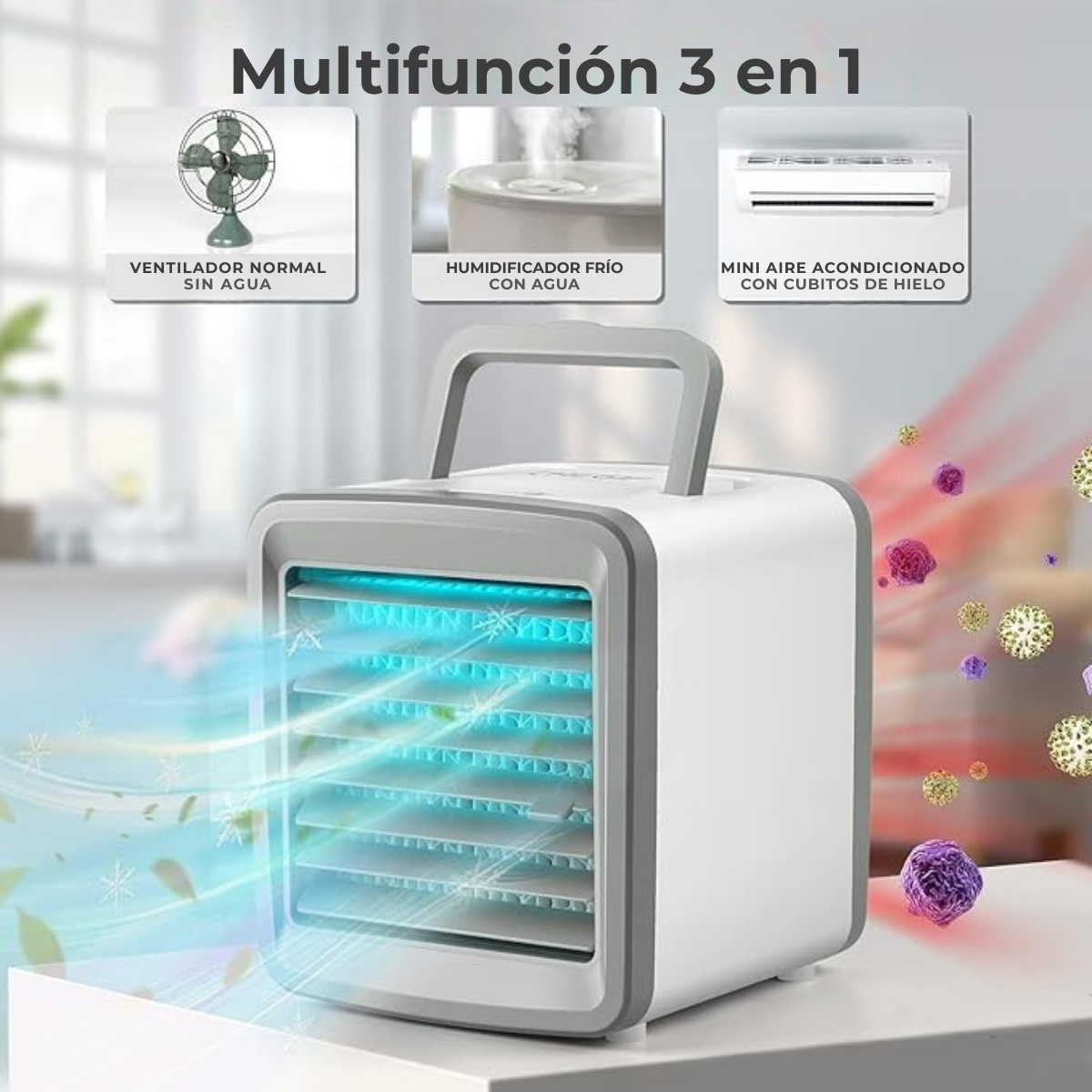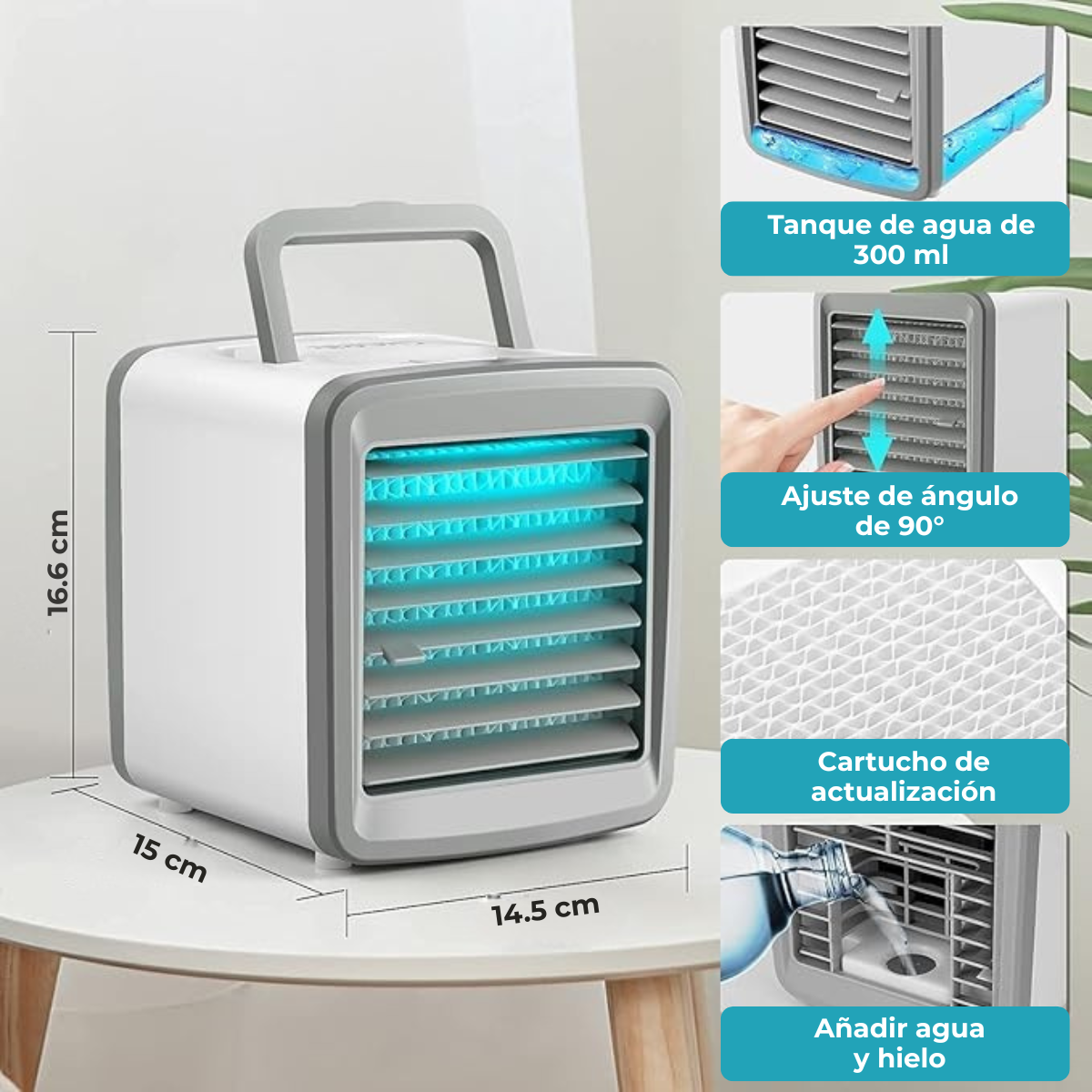 Mini climatizador 3 en 1: ventilador, humidificador y luz nocturna. Tanque de 300ml, 2 velocidades y batería recargable de 2400mAh.