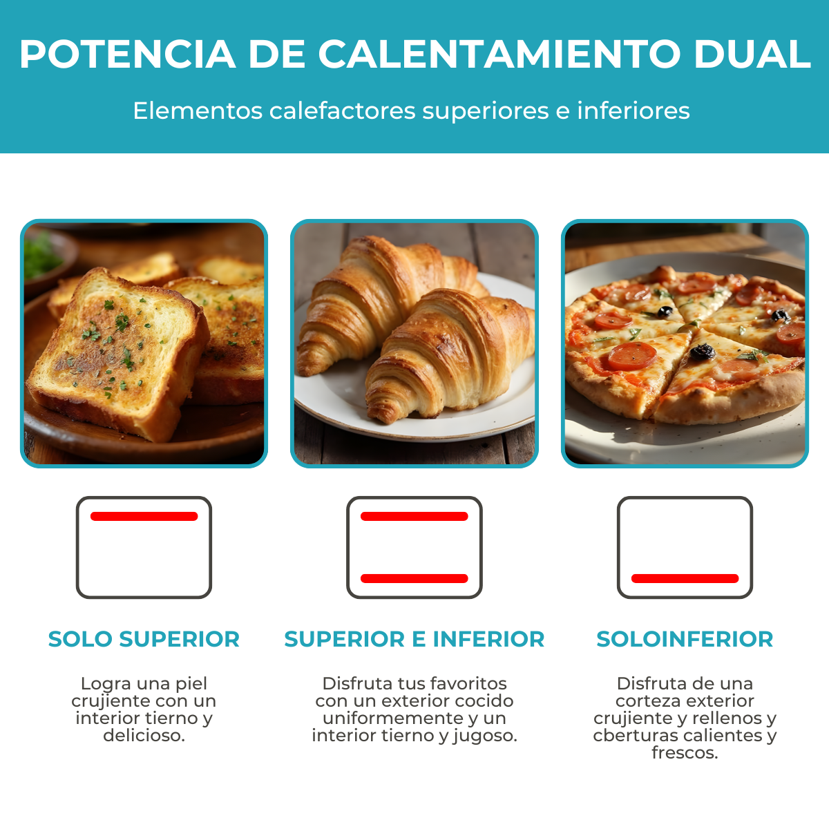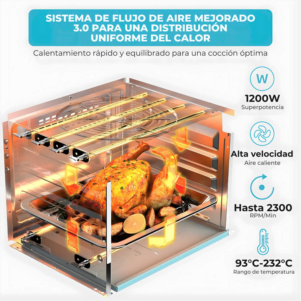 Su diseño moderno con carcasa en acero inoxidable o acabado spray, múltiples posiciones de rack y elementos calefactores de acero inoxidable garantizan un cocinado uniforme y saludable. Ideal para hogar y uso profesional ligero.
