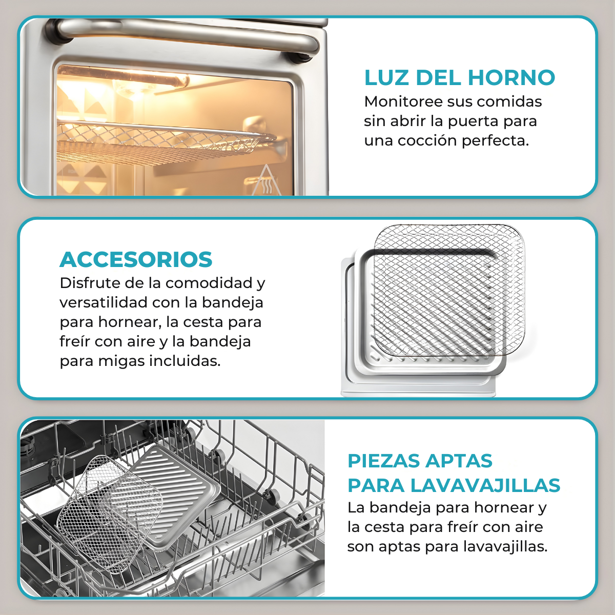 Cocina saludable y versátil con capacidad de 15 litros, múltiples funciones y accesorios para hornear, asar y deshidratar.