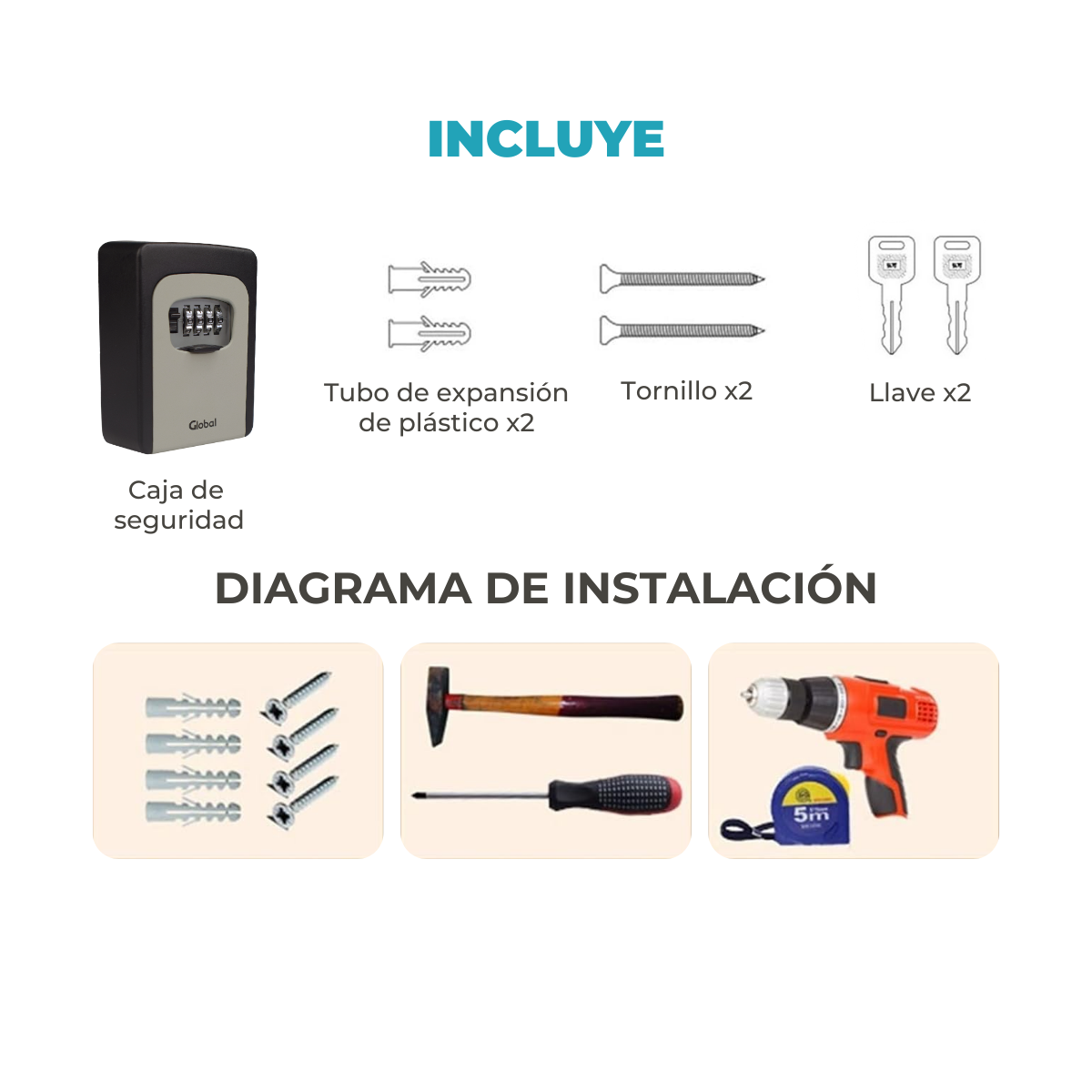 Incluye: caja con combinación mecánica, 2 llaves, manual y tornillos de montaje.