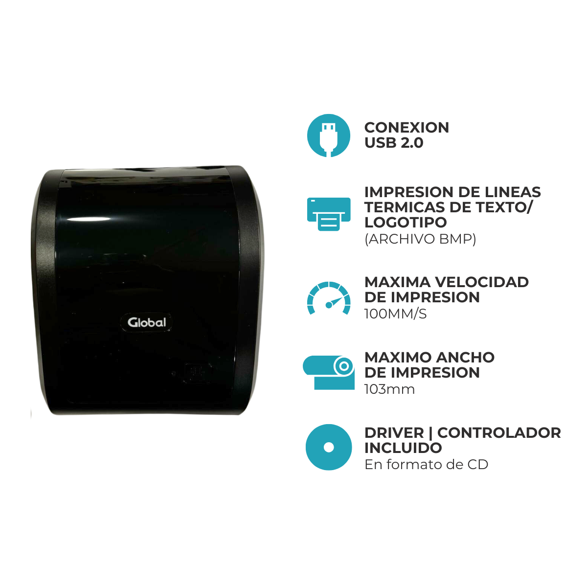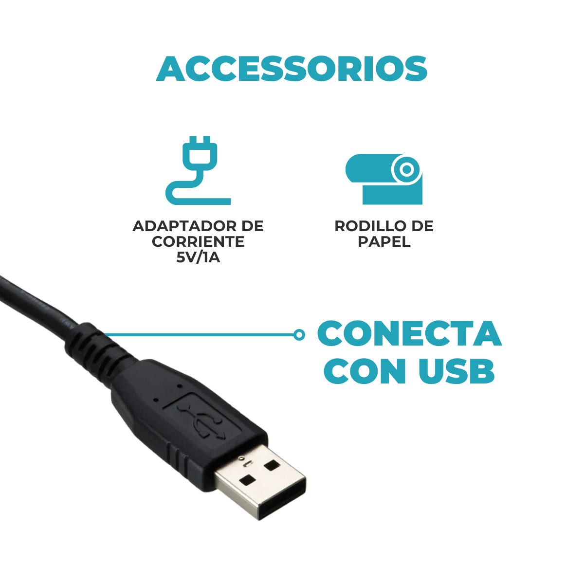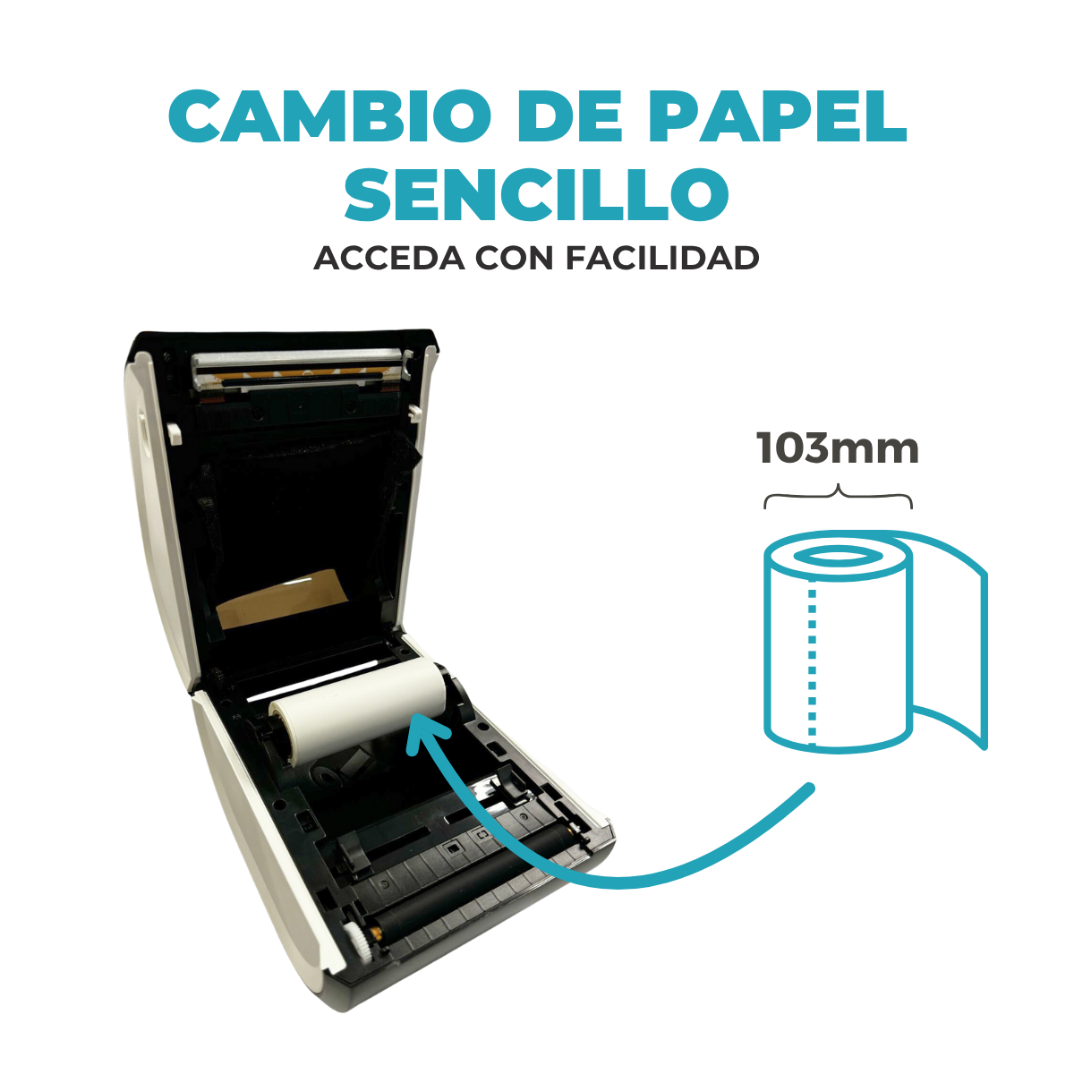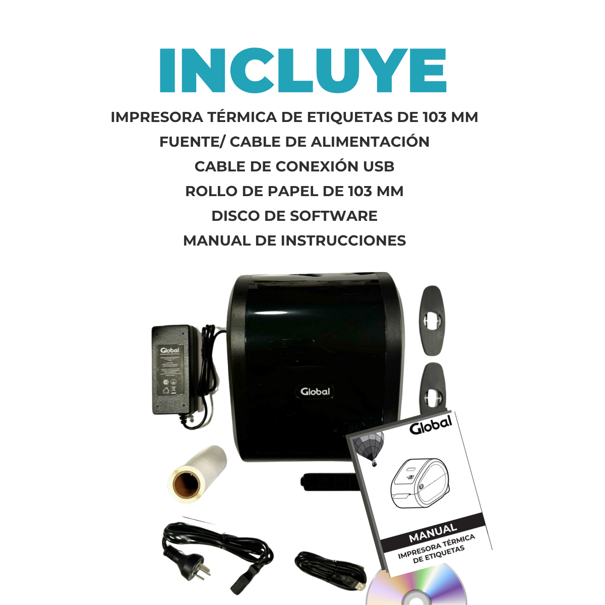 Incluye Fuente, cable USB, drivers, manual, rollo 103 mm