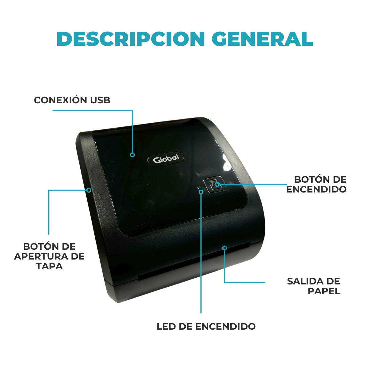 Cuenta con una resolución de 203 DPI, velocidad de impresión de 100 mm/s y es capaz de imprimir etiquetas de hasta 103 mm de ancho. Compatible con códigos 1D y 2D, ofrece interfaz USB 2.0 y soporte para múltiples lenguajes como ZPL II y TSPL. Incluye todo lo necesario para comenzar a imprimir: cable USB, fuente, drivers y un rollo de papel.
