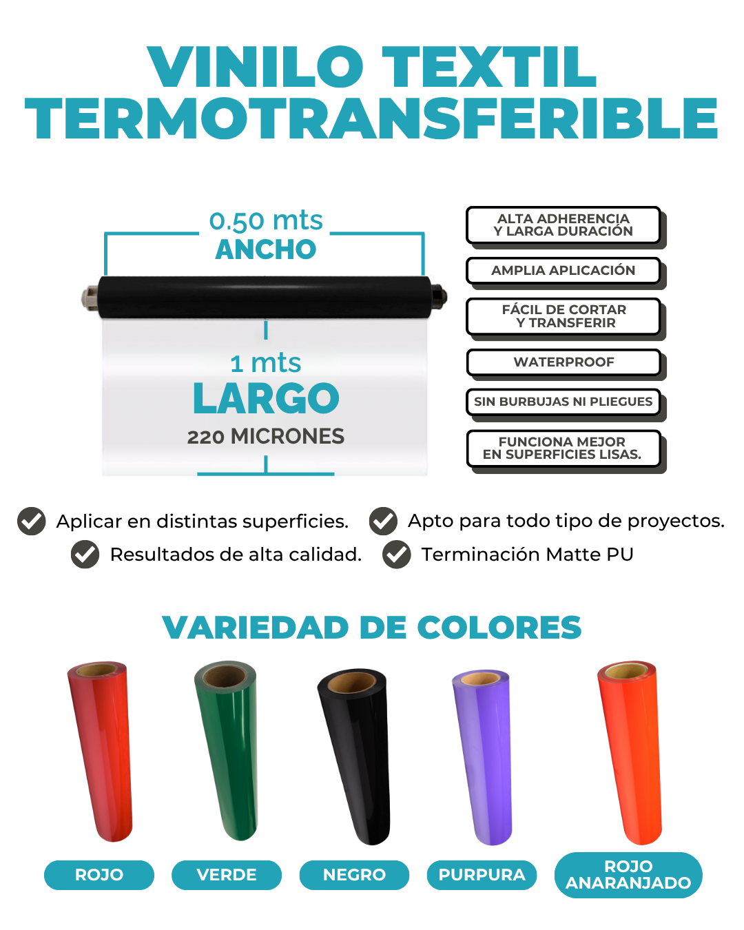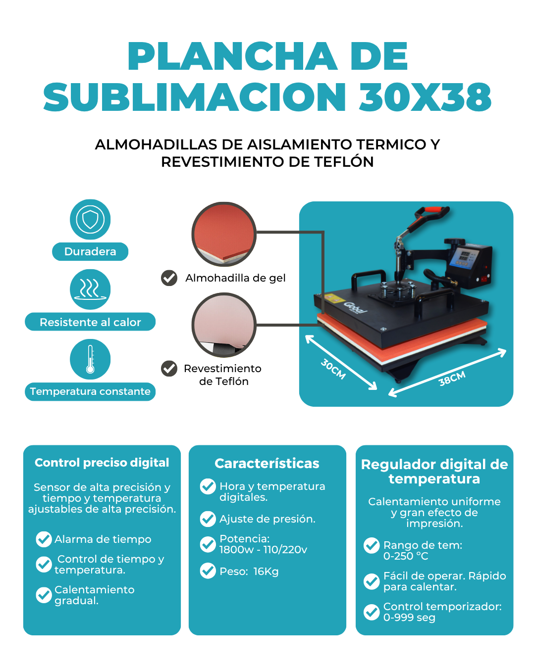 Incluye una plancha térmica profesional de 30×38 cm, vinilo termotransferible textil PU y cinta térmica resistente al calor. Diseñado para brindar transferencias precisas y acabados uniformes en todo tipo de prendas.