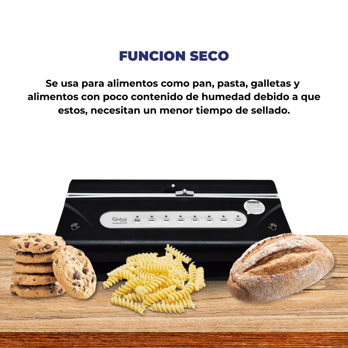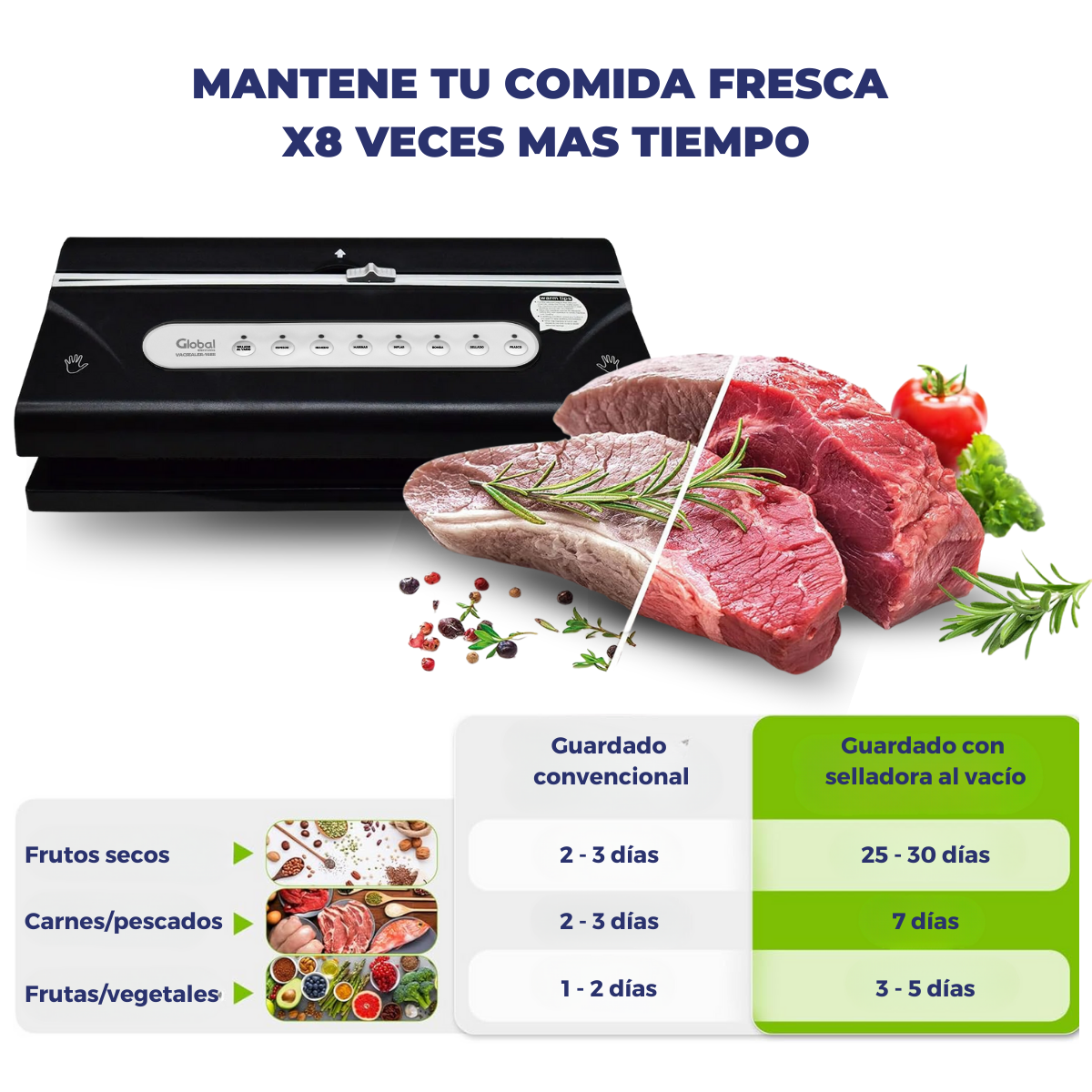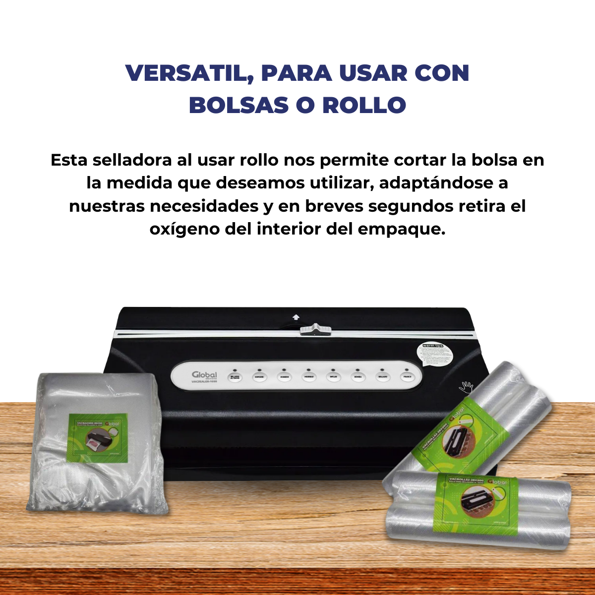 Ideal para alimentos secos, húmedos y función de marinado, con portarollo, cortador e inflado para proteger productos frágiles