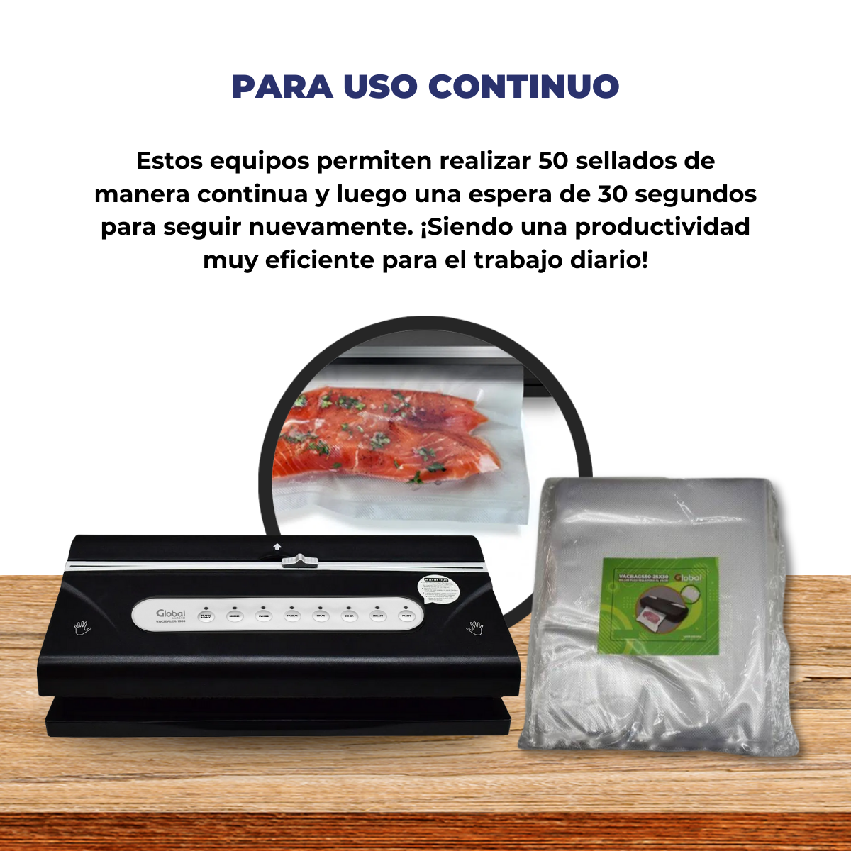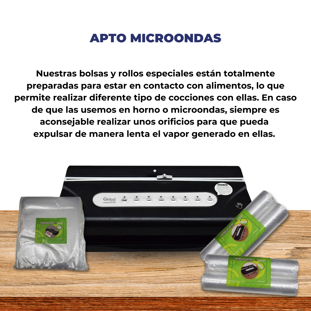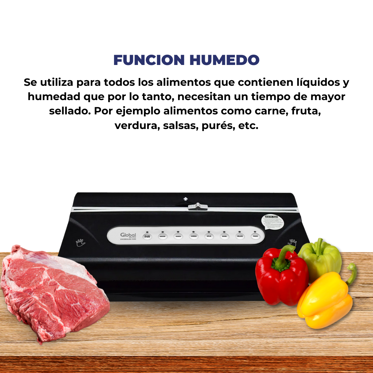 Ideal para alimentos secos, húmedos y función de marinado, con portarollo, cortador e inflado para proteger productos frágiles